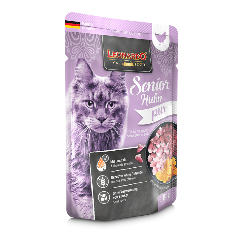 Leonardo Fines Selection Senior Pur Poulet est un choix idéal pour les chats âgés qui ont besoin d'une alimentation douce et nutritive . Sa formule sans céréales ni sucre facilite la digestion , tandis que les acides gras polyinsaturés contenus dans l'huile de saumon contribuent au maintien d'un pelage sain et brillant . Parfait pour les chats qui apprécient les saveurs simples et qui nécessitent une alimentation adaptée à leur âge .