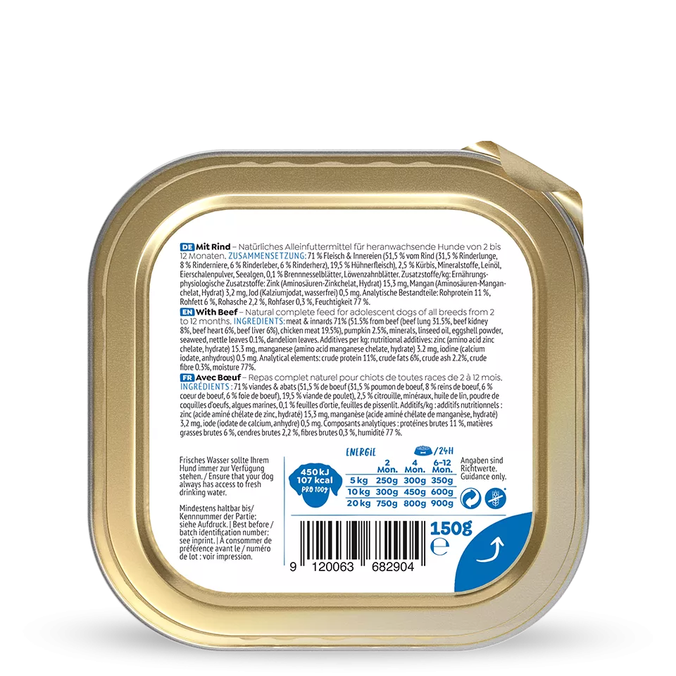 Une recette spécialement conçue pour les chiots en pleine croissance. Nous utilisons du bœuf de haute qualité comme principale source de protéines, associé à de la citrouille sucrée qui apporte vitamines et fibres pour une digestion douce, et une touche d' ortie qui favorise le métabolisme et le bon développement des jeunes chiots.