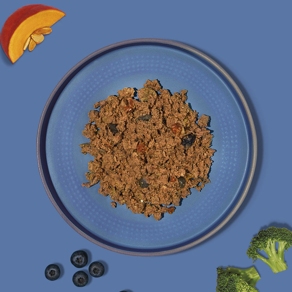 Cordero 85% (Cordero fresco 60%, caldo de cordero 25%), calabaza 5%, proteína de patata 2%, arándanos, minerales, aceite de girasol, semilla de lino 0,03%, inulina (fuente de FOS) 0,02%, pared celular hidrolizada de levaduras (fuente de MOS) 0,02%, condroitina 200 mg/kg, brócoli 100 mg/kg, kelp 100 mg/kg, romero 100 mg/kg, cúrcuma 100 mg/kg.
