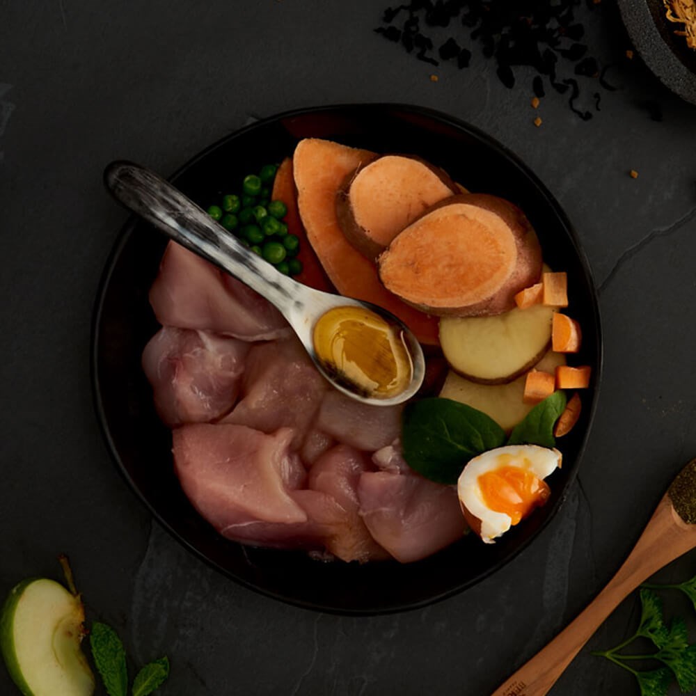 Pavo fresco (26%), pollo deshidratado (25%), batata, patata, guisantes, grasa de pollo (4%), alfalfa, huevo deshidratado (3,1%), proteína de guisante, caldo de pollo (1,6%), aceite de salmón (1,2%), minerales, Plaque Off (2500 mg/kg), glucosamina (1000 mg/kg), metilsulfonilmetano (1000 mg/kg), fructooligosacáridos, sulfato de condroitina (700 mg/kg), menta, perejil, manzana, zanahoria, espinacas, psyllium, algas, manzanilla, caléndula, arándanos rojos, anís y fenogreco.
