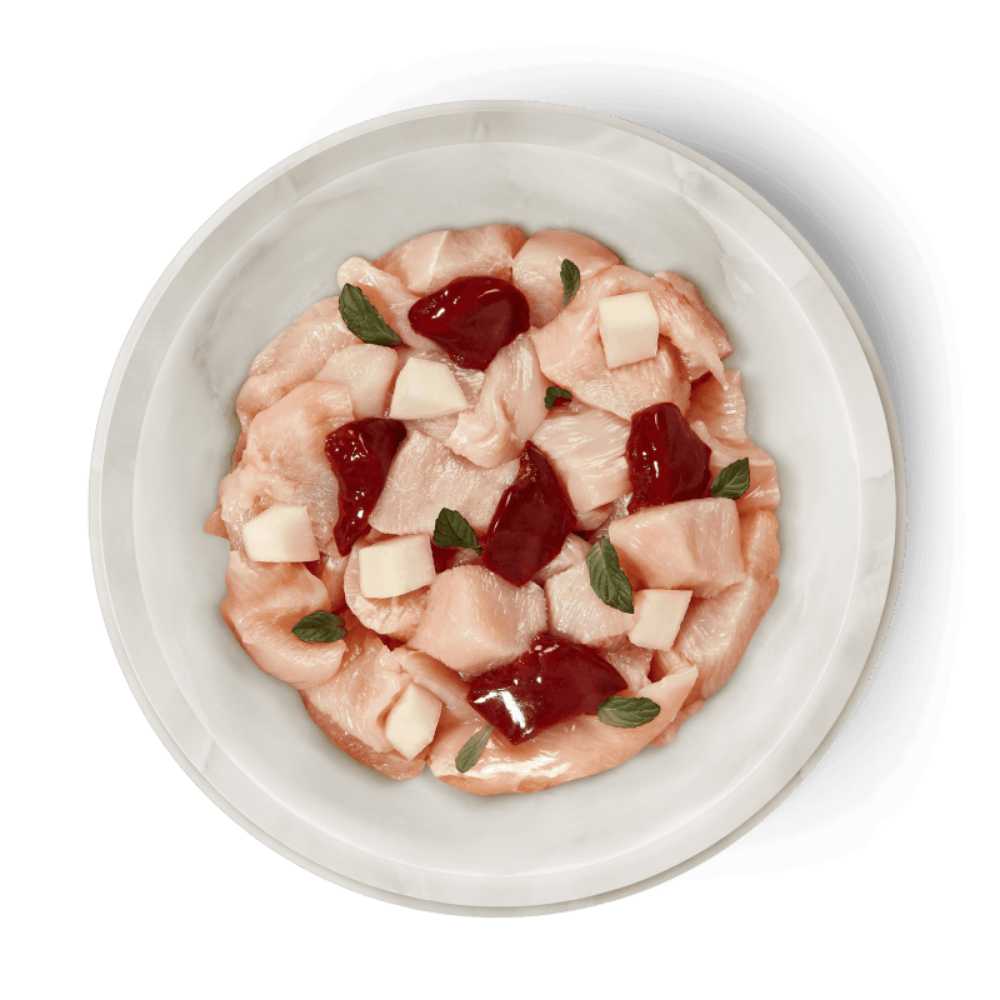 🥩 90 % carne fresca de pollo (músculo, corazón, hígado y estómago) ➝ proteínas de alta calidad para energía y masa muscular.
