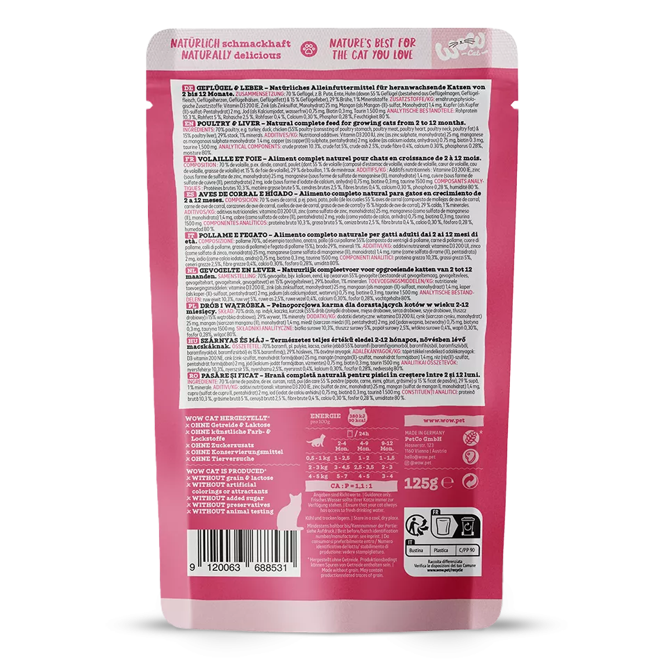 El WOW Gatitos con Ave e Hígado es una receta pensada especialmente para las necesidades delicadas de los gatitos 🐾. Combina carnes de ave de alta calidad con hígado, ofreciendo una fuente rica en proteínas y nutrientes esenciales, todo en una textura suave y deseable que conquista incluso los paladares más exigentes.